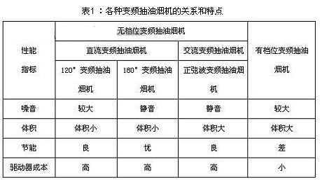 抽油煙機變頻的目的是為了通過調(diào)整抽油煙機上的帶動風(fēng)扇的電機轉(zhuǎn)速,進而根據(jù)油煙量的大小調(diào)整油煙抽吸的快慢。優(yōu)良的調(diào)速和節(jié)能效果使得變頻抽油煙機在性能上明顯優(yōu)越于傳統(tǒng)的抽油煙機,而變頻抽油煙機根據(jù)具體的變頻技術(shù)有不同的分類和性能特點,如表1所示。