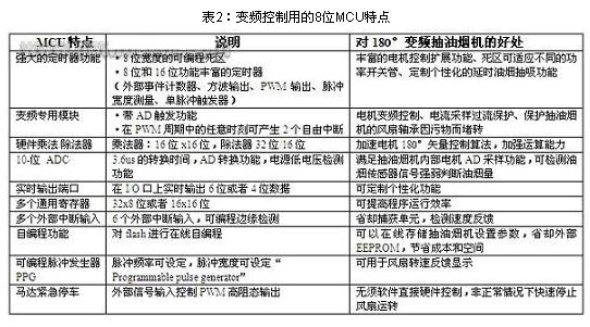 此外,這些MCU還具有帶2個自由中斷專用變頻控制模塊,以在PWM周期的任意時刻產(chǎn)生中斷,根據(jù)用戶需要的任意時刻對電流進行采樣;專用于控制 PWM高阻態(tài)輸出的獨立外部信號輸入,可在非正常情況下快速停止風(fēng)扇的轉(zhuǎn)動;以及8位的可編程死區(qū)控制(死區(qū)時間范圍:0.1 s~25.6 s)等。圖2顯示了8位變頻控制MCU的主要特點,表2則這些功能給出了詳細說明。