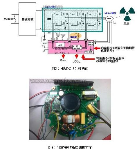 圖3是180變頻抽油煙機方案實物圖??梢钥闯?,180°變頻抽油煙機方案,硬件電路板可安裝在電機的側(cè)面端蓋中,以減小抽油煙機總體積。