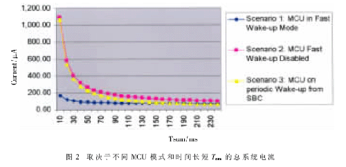 為了證明采用這種方法能夠節(jié)約電源,對現(xiàn)實生活中的實例進行了評估。圖2顯示了普通系統(tǒng)基礎(chǔ)芯片(SBC)系統(tǒng)電流和S12X 車門系統(tǒng)電流在不同喚醒方法和圖1中顯示的時間參數(shù):