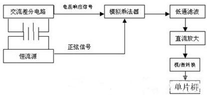 為了解決上述各方法的缺陷,本文采用了四端子測量方式,將蓄電池兩端上的電壓響應(yīng)信號(hào)通過交流差分電路與產(chǎn)生恒定交流源的正弦信號(hào)經(jīng)過模擬乘法器相乘,再將模擬乘法器的輸出電壓信號(hào)通過濾波電路,使交流信號(hào)轉(zhuǎn)變?yōu)橹绷餍盘?hào),直流信號(hào)經(jīng)直流放大器放大后進(jìn)行模數(shù)轉(zhuǎn)換,將轉(zhuǎn)換后的值送入單片機(jī)進(jìn)行簡單處理。