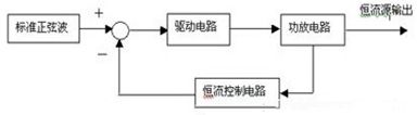 電路組成框圖如圖2所示:這是一個(gè)閉環(huán)控制系統(tǒng),電流負(fù)反饋電路。標(biāo)準(zhǔn)正弦波產(chǎn)生一個(gè)頻率穩(wěn)定、對稱、失真度低的1KHz正弦波信號(hào)。驅(qū)動(dòng)電路把正弦波放大,去推動(dòng)功放電路,得到正弦交流電流輸出。恒流控制電路從功放輸出中得到的信號(hào),通過與給定的信號(hào)相比較,來調(diào)節(jié)驅(qū)動(dòng)電路的信號(hào),從而使輸出電流保持穩(wěn)定。