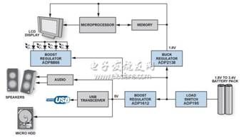 圖1顯示采用兩節(jié)串聯(lián)的AA電池供電的典型低功耗系統(tǒng)。電可用輸出范圍約為1.8 V至3.4 V,而IC工作時需要1.8 V和5.0 V 電壓。升壓轉換器可在不增加電池單元數(shù)量的情況下提升電壓,從而為WLED背光、微型硬盤驅動器、音頻設備和USB外設供電,而降壓轉換器可為微處理器、內存和顯示器供電。