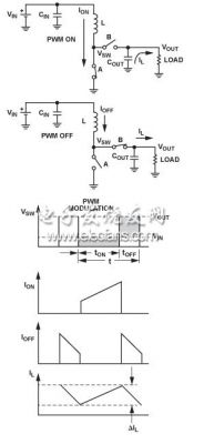 注意,開關調節(jié)器既可以連續(xù)工作,也可以斷續(xù)工作以連續(xù)導通模式 (CCM), 工作時,電感電流不會降至0;以斷續(xù)導通模式 (DCM),工作時,電感電流可以降至0. 電流紋波,在圖2中顯示為ΔIL 使用公式ΔIL = (VIN × tON)/L.計算。平均電感電流流入負載,而紋波電流流入輸出電容。