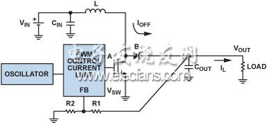 使用肖特基二極管代替開關B的調節(jié)器定義為異步 (或非同步), 調節(jié)器,而使用FET作為開關B的調節(jié)器定義為同步調節(jié)器。圖3中,開關A和B已分別使用內部NFET和外部肖特基二極管來實施,從而形成異步升壓調節(jié)器。對于需要負載隔離和低關斷電流的低功耗應用,可添加外部FET,如圖4所示。將器件的EN引腳驅動至0.3 V以下便可關斷調節(jié)器,使輸入與輸出完全斷開。
