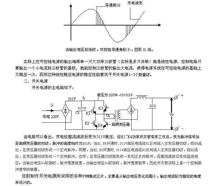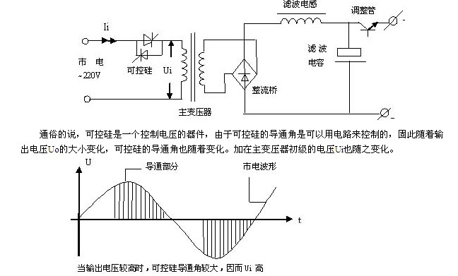 也就是~220V市電經(jīng)可控硅控制后只有一部分加在主變壓器的初級(jí)。當(dāng)輸出電壓Uo較高時(shí),可控硅導(dǎo)通角較大,大部分市電電壓被可控硅“放過來了”(如上圖所示),因而加在變壓器初級(jí)的電壓,即Ui較高,這當(dāng)然經(jīng)整流濾波后輸出電壓也就比較高了。