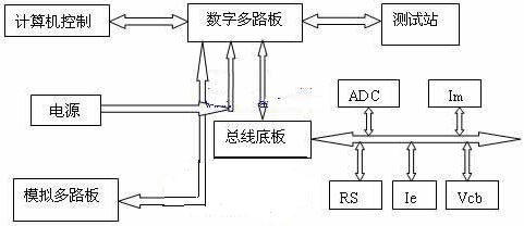熱阻測(cè)試系統(tǒng)的基本構(gòu)架是計(jì)算機(jī)通過(guò)軟件控制精密模擬和數(shù)字電路,實(shí)現(xiàn)對(duì)被測(cè)器件的條件施加→結(jié)果采樣→篩選→計(jì)算→比較→判別等一系列程序控制,完成對(duì)被測(cè)器件電參數(shù)的自動(dòng)測(cè)試,每次測(cè)試的全過(guò)程小于0.2秒。系統(tǒng)主要有模擬多路板、數(shù)字多路板、ADC板、Im 板、Ie板和Vcb板組成,如圖1所示。