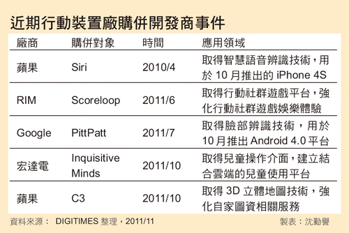 移動裝置市場競爭激烈,蘋果、Google、宏達電等大廠為凸顯產(chǎn)品獨特性,購并開發(fā)商成為重要布局。