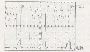 圖5所示的是工作在完全能量轉(zhuǎn)換狀態(tài)下, 開關(guān)管Q1上的電壓與電流波形。在這種工作模式下, 每個(gè)開關(guān)周期被分為三個(gè)階段( 分別如圖中1、2、3所示) .在階段1, 開關(guān)管導(dǎo)通, 變壓器原邊電流沿斜線上升到峰值電流, 并將能量?jī)?chǔ)存在高頻變壓器中。