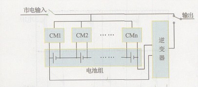 圖2所示是本文提出的一種蓄電池組均衡充電模式結(jié)構(gòu)示意圖, 圖中CM表示充電器或充電模塊。在這種均衡式充電模式中, 對(duì)電池組的每一節(jié)電池都單獨(dú)配置一個(gè)充電模塊, 它是均衡式充電裝置的核心。在應(yīng)急電源中, 當(dāng)處于非應(yīng)急狀態(tài)運(yùn)行時(shí), 應(yīng)急電源的輸出通過開關(guān)直接由市電供給, 這時(shí), 逆變器不工作, 各充電模塊給各節(jié)相應(yīng)的電池進(jìn)行充電或浮充電。當(dāng)應(yīng)急電源處于應(yīng)急工作狀態(tài)時(shí), 由電池組給逆變器供電, 通過逆變器輸出應(yīng)急逆變交流電源。這時(shí), 由于各充電模塊無交流輸入, 處于不工作狀態(tài), 不影響蓄電池組的放電工作狀態(tài)。