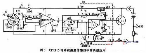 圖3是XTR115電路在溫度傳感器中的典型應(yīng)用,溫度傳感器PT100和RE1、RE2、RE3組成測(cè)量橋路,恒流二極管2HD2為橋路提供2 mA的供電電流,運(yùn)算放大器INA128組成差動(dòng)放大電路,輸出被偏置在Vo=2.5 V的工作點(diǎn)上。放大器的輸出通過(guò)電阻RIN接到電流環(huán)變換電路XTR115。運(yùn)算放大器INA128的靜態(tài)電流為700μA;所以輸出端還須加入1.3 mA的偏置電流,這個(gè)電流可以通過(guò)電流偏置電阻Rs獲得,Rs=2.5V/(1.3 mA/100)=192.3kΩ。