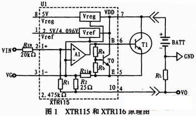 XTR115和XTR116用SO-8小型化封裝,其結(jié)構(gòu)組成及原理圖如圖1所示,XTR115和XTR116內(nèi)部電路主要由3部分組成。