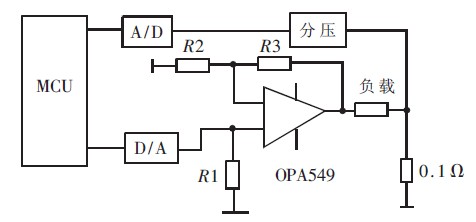 在該電源系統(tǒng)中, 主要為負(fù)載提供大電流, 采用PID 控制算法控制負(fù)載的發(fā)光強度。輸入為單片機經(jīng)DAC輸出的控制電壓, 一路為比例放大電路, 如圖1 所示增益G=1+R3/R2.電流型DAC 通過R1 轉(zhuǎn)換成電壓, 控制OPA549 .輸出電流經(jīng)采樣電阻轉(zhuǎn)換為采樣電壓, 送入A/D 轉(zhuǎn)換器反饋至單片機進(jìn)行偏差值補償。