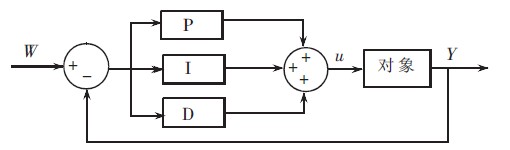 PID 控制原理如圖2 所示。PID 控制是一種線性調(diào)節(jié)器, 它把設(shè)定值W 與實際輸出值相減, 得到控制偏差e .偏差值e 經(jīng)比例、積分、微分后通過線性組合構(gòu)成控制量U, 對對象進(jìn)行控制。其中比例調(diào)節(jié)器起到基礎(chǔ)調(diào)節(jié)作用, 主要對控制系統(tǒng)的靈敏度和控制速度有影響。積分調(diào)節(jié)器可以自動調(diào)節(jié)控制量, 消除穩(wěn)態(tài)誤差,使系統(tǒng)趨于穩(wěn)定。微分調(diào)節(jié)器可以減小超調(diào), 克服振蕩, 同時加快系統(tǒng)的穩(wěn)定速度, 縮短調(diào)整時間, 從而改善系統(tǒng)的動態(tài)性能。