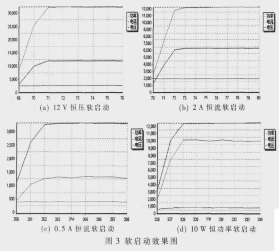 從圖3 的軟啟動效果圖可以看出, 在恒定電壓、電流、功率的模式下工作時, 系統(tǒng)開機過程超調(diào)量很小, 有效地控制了啟動過程, 防止了啟動過程產(chǎn)生過大的擾動電壓, 產(chǎn)生過大的功率, 有效地保護(hù)了負(fù)載。