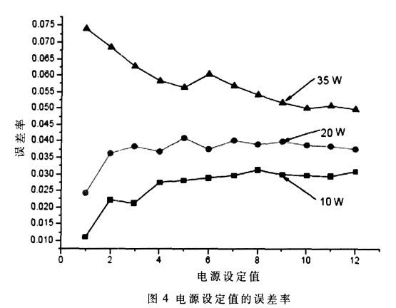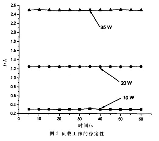 由于輸出電流達(dá)到8 A, 對電源的功率要求較高, 易產(chǎn)生噪聲, 這種隨機噪聲也會對輸出電流產(chǎn)生一定的影響。為減弱這種噪聲, 各個模塊分別供電, 以減少交叉干擾, 同時在電路板上多加裝去耦濾波電容, 減小干擾的影響, 同時OPA549 能有效地抑制紋波。影響電源穩(wěn)定性的因素很多, 如負(fù)載的變化、取樣電阻的變化、A/D、D/A 的影響等。如圖4 所示, 不同負(fù)載的情況下, 電源誤差不同。10 W 的負(fù)載, 由于功率較低, 在電壓、電流增加時, 誤差變化也較小。35 W 的負(fù)載, 由于功率較大, 工作電流的變化范圍比較大, 功耗較大, 電源的誤差變化相應(yīng)地也比較大。如圖5, 在10 W、20 W 和35 W 的負(fù)載時, 工作狀態(tài)穩(wěn)定, 能夠滿足大電流、大功率的需要。