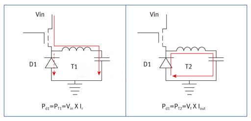 當(dāng)時(shí)間為T(mén)2時(shí),輸出電流(Iout)流經(jīng)D1。所產(chǎn)生的損耗與D1的正向電壓(Vfw)和輸出電流直接相關(guān)。PT2等于Iout*Vfw。顯然,我們希望盡可能降低以控制損耗,減少發(fā)熱。