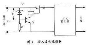 開關(guān)穩(wěn)壓器的過電壓保護(hù)包括輸入過電壓保護(hù)和輸出過電壓保護(hù)。開關(guān)穩(wěn)壓器所使用的未穩(wěn)壓直流電源諸如蓄電池和整流器的電壓如果過高,使開關(guān)穩(wěn)壓器不能正常工作,甚至損壞內(nèi)部器件,因此,有必要使用輸入過電壓保護(hù)電路。用晶體管和繼電器組成的過電壓保護(hù)電路如圖3所示。