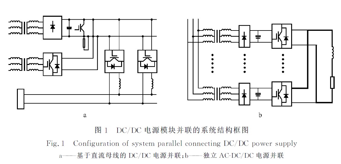 采用圖1a所示的拓?fù)浣Y(jié)構(gòu),系統(tǒng)需大容量不可調(diào)直流電源,一般可采用整流變壓器降壓,二極管整流并經(jīng)電容濾波得到。這種結(jié)構(gòu)雖可保證并聯(lián)的每條支路有共同的直流電壓輸入,避免并聯(lián)支路因直流側(cè)輸入電壓不同而帶來的不均衡,但該直流電源的容量大,電流達(dá)20KA,直流母線承受的負(fù)荷過重,前級AC-DC設(shè)備要求較高,不易實現(xiàn)。另外,輸入端共用母線不利于實現(xiàn)完全意義上的獨立電源模塊的并聯(lián)。因此,采用如圖1b所示的AC-DC/DC直流電源并聯(lián)的拓?fù)浣Y(jié)構(gòu)。