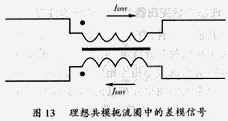 差模電流以相反的方向流過(guò)共模扼流圈的繞阻,建立大小相等,極性相反的磁場(chǎng),它能使輸出相互抵消,見(jiàn)圖13。這就使共模扼流圈對(duì)差模信號(hào)的阻抗為零。差模信號(hào)能不受阻地通過(guò)共模扼流圈。