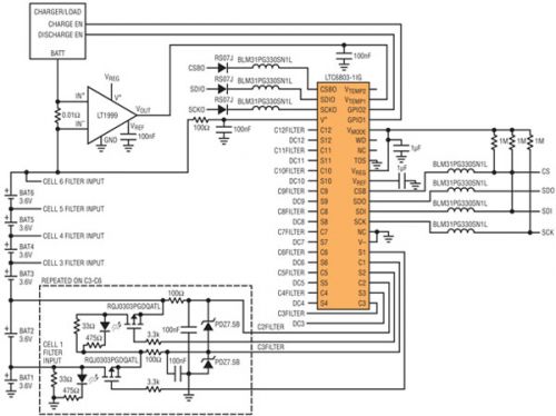 硬件設(shè)計(jì)的主要關(guān)注之處是確定合適的平衡電流,該電流由所用旁路電阻器的值設(shè)定。所需的平衡電流大部分取決于電池的容量、可允許的平衡時(shí)間、預(yù)期的不平衡程度以及電阻器將怎樣使用。如果電阻器用來旁路充電器的電流,那么它將設(shè)定為分流幾個(gè)安培的電流。如果平衡電阻器用來泄放過多的電荷,那么該電阻器的大小要滿足所希望的平衡時(shí)間。無源平衡僅能糾正源自電池組加載的 SOC 不平衡,而電池組加載則是由電池監(jiān)視電路、電池本身放電以及內(nèi)部電阻效應(yīng)引起的。如果持續(xù)監(jiān)視,那么這些 SOC 不平衡的來源每天應(yīng)該僅產(chǎn)生少量的不平衡。用于這次實(shí)驗(yàn)室評(píng)估的電池監(jiān)視系統(tǒng)采用了一個(gè) 33Ω 的平衡電阻器,該電阻器設(shè)定大約 100mA 的平衡電流,就小型電池而言,這一平衡電流很大,但是這樣的平衡電流允許平衡操作用更短的時(shí)間來完成。