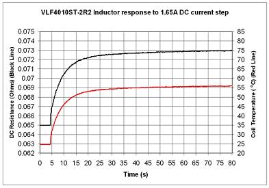 圖5中所示的測試示例在LM3554的電路中使用了VLS4010ST-2R2,直流電流階躍為1.65A。室溫時(shí)的電阻開始時(shí)為65mΩ。超過30秒之后,電感器達(dá)到穩(wěn)態(tài),電阻變?yōu)?3mΩ,相應(yīng)的穩(wěn)態(tài)工作溫度大約為 56℃。