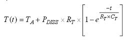 在穩(wěn)態(tài)下,LEDI/NTC的ESD二極管的VF為-622mV,對應(yīng)結(jié)溫 95.2℃(環(huán)境溫度為25℃時(shí))。在穩(wěn)定狀態(tài)下,測得的PFET導(dǎo)通電阻為154mΩ,對應(yīng)結(jié)溫105℃。圖3 還描繪了LM3554的熱容。VF和RPMOS的響應(yīng)表現(xiàn)呈現(xiàn)類似于一階RC的指數(shù)級上升,計(jì)算等式如下: