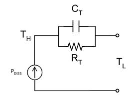 該模擬可以深入進(jìn)行,以描述器件的另一個(gè)熱屬性,稱之為熱容。正如將熱阻模擬為電阻,可以將熱容(CT,單位為J/℃)模擬為電容。將熱容與熱阻并聯(lián)獲得熱阻抗(ZT)。圖1所示為傳導(dǎo)傳熱的簡化RC模型。能源被模型化為電流源,熱阻抗被模型化為CT與RT并聯(lián)。