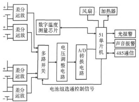 具有高電壓、高容量、循環(huán)壽命長、安全性能好等優(yōu)點(diǎn)的鋰離子電池,在便攜式電子設(shè)備、電動(dòng)汽車、空間技術(shù)、國防工業(yè)等多方面具有廣闊的應(yīng)用前景。由若干節(jié)鋰離子電池經(jīng)串聯(lián)組成的動(dòng)力鋰離子電池組目前應(yīng)用最為廣泛。由于每節(jié)單體電池的電壓不一致,使用中電池不允許過充電、過放電,電池的性能和壽命受溫度影響較大等特點(diǎn),必須對(duì)串聯(lián)鋰離子電池組進(jìn)行監(jiān)測,確保在使用中鋰離子電池具有良好的狀態(tài),或者使用中電池出現(xiàn)問題立即報(bào)警,電源管理系統(tǒng)立即采取保障措施,并提醒相關(guān)人員檢修。單體電壓和電池組的溫度是辨別串聯(lián)鋰離子電池組是否正常工作的主要技術(shù)指標(biāo)。采用直接采樣法,將要測量的單體電池電壓存儲(chǔ)在非電容上進(jìn)行測量。該方法反應(yīng)時(shí)間慢、誤差較大、控制復(fù)雜; 采用運(yùn)放和光藕繼電器來測量串聯(lián)電池組的單體電壓。該方法對(duì)光耦的線性度要求很高,導(dǎo)致硬件成本較高。目前,直接采用集成芯片的串聯(lián)鋰離子電池組監(jiān)控系統(tǒng)受到青睞,但該方法串聯(lián)電池的數(shù)目固定,導(dǎo)致應(yīng)用不靈活、硬件成本高等缺點(diǎn)。文中研制了一種動(dòng)力鋰離子電池組監(jiān)測系統(tǒng),對(duì)串聯(lián)鋰離子電池組的單體電壓和電池組的溫度進(jìn)行在線監(jiān)測,當(dāng)單體電池電壓偏離規(guī)定區(qū)間時(shí),監(jiān)測系統(tǒng)啟動(dòng)報(bào)警程序進(jìn)行聲、光報(bào)警; 當(dāng)電池組溫度偏離規(guī)定的區(qū)間時(shí),監(jiān)測系統(tǒng)啟動(dòng)風(fēng)扇或加熱控制電路,并存儲(chǔ)有關(guān)數(shù)據(jù),確保電池組正常工作。整個(gè)監(jiān)測系統(tǒng)具有連續(xù)測量分量、簡單經(jīng)濟(jì)、精度高和可靠性高的特點(diǎn)。