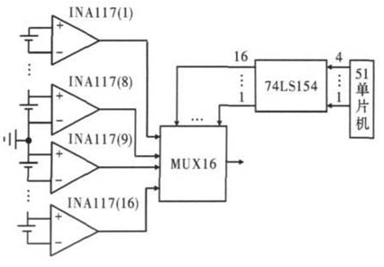 每節(jié)鋰離子電池最高電壓為5 V,由圖3 可得,第1 個(gè)INA117 的3 腳的輸入電勢最高為40 V.同理,第16 個(gè)INA117 的2 腳輸入電勢最低為- 40 V.第1 至8 個(gè)INA117 的輸出電壓為正,第9 至16 個(gè)INA117 的輸出電壓為負(fù),所以多選一模擬開關(guān)和A/D 轉(zhuǎn)換器都要求可以輸入正、負(fù)電壓。多選一模擬開關(guān)選用MUX16,為16 選1 可正負(fù)電壓輸入模擬開關(guān),因此16節(jié)電池只需1 個(gè)MUX16.但由于單片機(jī)IO 口有限,文中用一片74LS154 擴(kuò)展了IO 口,僅用單片機(jī)的4 個(gè)IO 口即可控制MUX16 分別選通單節(jié)鋰離子電池進(jìn)行電壓采樣。