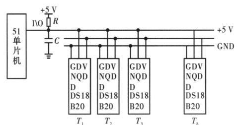 針對(duì)串聯(lián)電池組,傳統(tǒng)的測溫方法多采用模擬溫度傳感器進(jìn)行測量,在數(shù)據(jù)的采集和傳輸過程中易受外界環(huán)境的干擾,從而使測得的結(jié)果誤差較大,且當(dāng)測量點(diǎn)較多時(shí),連線較復(fù)雜。文中采用單片機(jī)和單總線數(shù)字式溫度傳感器DS18B20 來解決上述問題。其原理如圖5 所示。