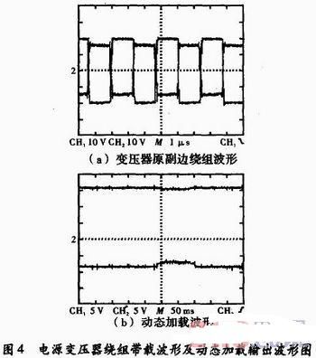 圖4(a)所示為實(shí)際全橋DC-DC電源變壓器原邊及副邊繞組帶載波形,其中CH1為原邊線圈兩端電壓,CH2為副邊線圈正電壓。由于器件分散性,實(shí)際測(cè)試DC-DC電源工作頻率為366 kHz,頻率偏差為3.8%,滿足設(shè)計(jì)要求。圖4(b)所示為動(dòng)態(tài)加載輸出波形,其中CH1為輸出正電壓,CH2為輸出負(fù)電壓。測(cè)試時(shí)負(fù)載為35 Ω/10 W,可以看到突加突卸額定負(fù)載時(shí)輸出正電壓較平穩(wěn),波動(dòng)<1 V,滿足設(shè)計(jì)要求;負(fù)電壓稍有波動(dòng),考慮到IGBT負(fù)壓是用來(lái)維持關(guān)斷狀態(tài),負(fù)壓在-5~-15 V即可,因此滿足半橋集成驅(qū)動(dòng)電源的要求。