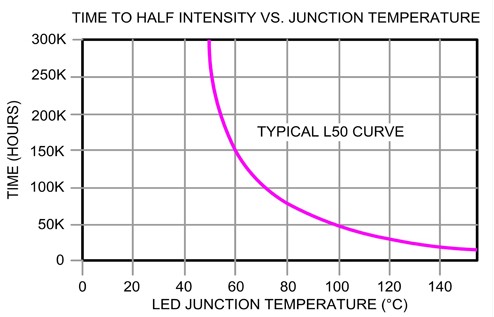 每種照明設(shè)備均存在光源使用壽命問題,經(jīng)常遭遇的狀況有類似白熾燈泡的鎢絲突然燒斷,或因長時間使用而使得光源材料因逐漸老化以致變暗而故障,LED亦因組件的接面溫度而出現(xiàn)老化現(xiàn)象。所有的照明設(shè)備在提供穩(wěn)定亮度條件下,于一定使用年限后,亮度勢必會逐漸低于有效亮度之下。在不同的照明應(yīng)用裝置中,皆有使用壽命時間限制。舉例來說,當(dāng)使用在路燈裝置的亮度已衰減至原先50%時,即代表使用年限,但使用在醫(yī)生內(nèi)視鏡的光源裝置可能亮度尚未衰減那么多。