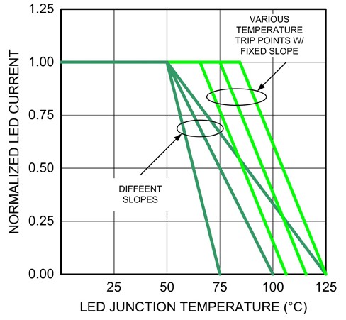 為防止組件遭受破壞或讓使用壽命縮短,必須進行熱能管理,且已有多種方法可以解決此問題。圖2為兩種不同的回折曲線,可在溫度上升時限制LED的電流流量。當(dāng)接面溫度保持在默認(rèn)溫度范圍內(nèi)時,就經(jīng)由主要的控制回路作為電流調(diào)節(jié);但當(dāng)接面溫度超過默認(rèn)范圍時,就會使用另一組控制回路限制電流大小。其中接面溫度的回折點與驅(qū)動電流的衰減率,均可依照不同的應(yīng)用和LED制造商的建議改變。