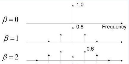 圖1顯示了通過正弦波改變調(diào)制指數(shù)產(chǎn)生的影響。當(dāng)Β=0時,沒有出現(xiàn)頻移,只有一條譜線。當(dāng)Β=1時,頻率特征開始延伸,且中心頻率分量下降了20%。當(dāng)Β=2時,該特征將進一步延伸,且最大頻率分量為初始狀態(tài)的60%。頻率調(diào)制理論可以用于量化該頻譜中能量的大小。Carson法則表明大部分能量都將被包含在2*(Δf+fm)帶寬中。