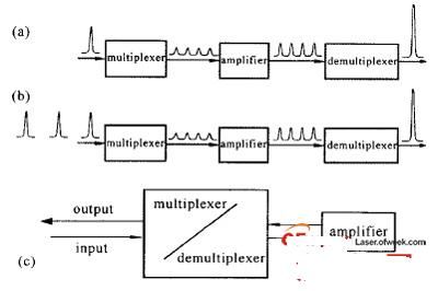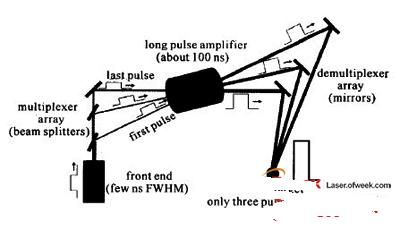 對于準(zhǔn)分子激光放大器,由于激活介質(zhì)的上能態(tài)儲能時間很短,必須連續(xù)補充瞬態(tài)儲能(Em)才能獲得高能輸出,即E=EmT/t,其中T是增益時間,t是增益恢復(fù)時間。對于電子束泵浦的準(zhǔn)分子激光放大器,增益時間可以長達(dá)200ns,T/t≈100,這意味著對于單個要放大的短脈沖,只能提取出很小一部分能量。為了持續(xù)提取出放大器中的儲能,通常使用光學(xué)多路編碼技術(shù)。