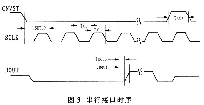 啟動(dòng)轉(zhuǎn)換和讀數(shù)據(jù)操作由CNVST和SCLK端的數(shù)字輸入信號(hào)控制。圖3示出時(shí)序關(guān)系,描述串行接口的工作方式。