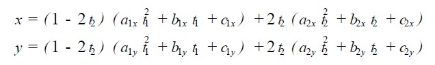 式中a1x , b1x , c1x , a1y , b1y , c1y為Si 段曲線的系數(shù),由Pi , Pi + 1 , Pi + 2三點控制,參變量為t1 ,在公共段范圍內t1∈[0. 5, 1 ];式中a2x , b2x , c2x , a2y , b2y , c2y為Si + 1段曲線的系數(shù),由Pi + 1 , Pi + 2 , Pi + 3三點控制,參變量為t2 ,在公共段范圍內t2 ∈[0, 0. 5 ]。