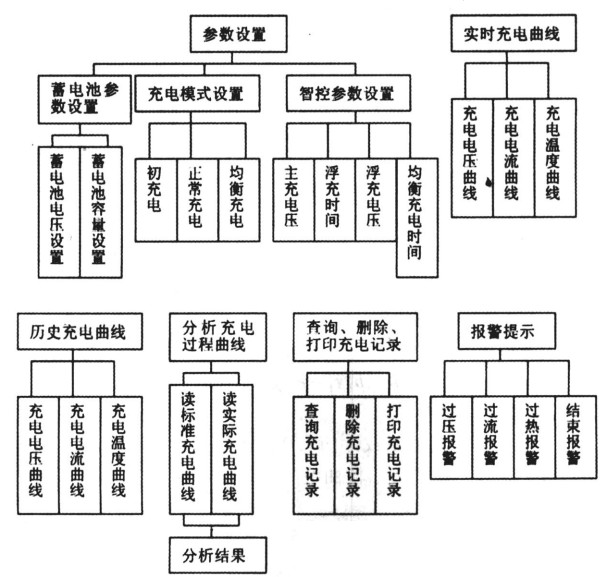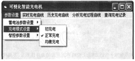 在參數(shù)設置中可以對框圖中所示的條目進行設置,使得該系統(tǒng)具有很強的通用性。電動車電池一般由幾個單體組合而成,可以選擇單體個數(shù)以確定電池組的電壓和容量。該系統(tǒng)提供了如框圖所示的三種充電模式,一般新電池前五次充電要進行初充電以充分激活電解質,當單體電量不同時要均衡充電,其余時正常充電。還可以按照需求設置不同充電階段的充電時間,來滿足各種電池的不同需求;實時充電曲線實時地顯示充電電流、電壓和電池溫度;歷史充電曲線可以顯示該電池組充電歷史;通過分析充電過程曲線即可了解電池存在的問題,如:蓄電池缺乏電解液、電解液比重不符合要求或蓄電池單體存在差異等,從而及時的對電池進行保養(yǎng);該系統(tǒng)還提供了按日期或電池編號查詢、刪除充電記錄的數(shù)據(jù)庫功能,方便了操作;報警提示用來告知用戶充電的過壓、過流、過熱情況以及充電是否結束。