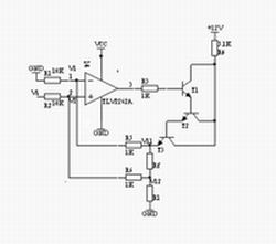 顯示模塊主要實現(xiàn)的功能是顯示設置的電流輸出值和其它人機交互信息。本部分可以采用七段數(shù)碼LED顯示器,顯示數(shù)字、簡單字母和小數(shù)點等信息,但由于其顯示信息單一,人機交互不友好,本文采用字符型液晶顯示屏LCDSMC1602A模塊。該模塊具有輕薄短小、低壓微功耗、體積小、無輻射、平面直角顯示及影像穩(wěn)定不閃爍等優(yōu)點,且可視面積大、面效果好、分辨率高、抗干擾能力強,適合用于顯示字母、數(shù)字、符號等信息,而且不需要擴展過多外圍電路,可由單片機直接進行控制輸出顯示。電壓-電流轉換模塊由精密運放與三個晶體管組成的達林頓管電路構成。轉換電路利用晶體管平坦的輸出特性和深度負反饋電路使輸出電流穩(wěn)定,如圖2所示,此V/I轉換電路的帶負載能力強,電流輸出范圍達0~3A。輸出電流Io經(jīng)反饋電阻Rf得到一個反饋電壓Vf,Vf= V11-V12,通過R5、R6加到運算放大器的兩輸入端,設運放兩端的電為V1、V2,Vi由單片機DAC輸出。因為理想運放的輸入電流約等于零,且 V1=V2,則: