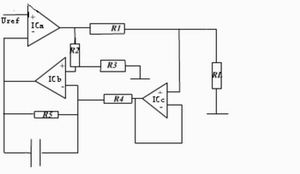 電壓-電流轉換模塊還有另外一種方案,即采用三個運放構成輸出電流可變的電流源,如圖3所示。輸出電流I=Vi/R1,為使R1兩端的電壓保持恒定,由差分放大器IC1b通過射隨器IC1c監(jiān)測R1兩端的電位,此電位經(jīng)IC1b的7腳加到比較器 ICa的反相輸入端與Vref比較,根據(jù)比較結果使比較器的輸出端變化,直到平衡為止,即Vr1=Vi。電路中的電容用于補償ICa的頻率,減少控制環(huán)路的延時。只要R1=R2=R3=R4=R5,此電路的性能較好,但帶負載能力不強,環(huán)路延時補償對電路的穩(wěn)定有較大影響。