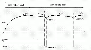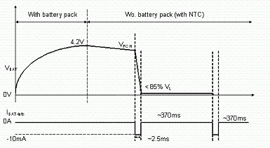 使用者亦有可能在充電或式充電完畢后,在未將電源移除的情況下,即抽離電池的情況。為避免造成危險(xiǎn),IC內(nèi)部應(yīng)具有如圖7, 8的電池存在偵測(cè)機(jī)制。充電IC會(huì)以短時(shí)間脈沖(每370ms產(chǎn)生2ms的脈沖)方式抽取電池電流,此時(shí)若電池存在,則偵測(cè)到的電池電壓應(yīng)大于一預(yù)設(shè)閥值;若電池已切離,則充電IC偵測(cè)到一低電壓,即可判定為電池?cái)嚅_狀態(tài),并將電池端電壓切斷,保護(hù)使用者安全。
