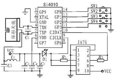 無(wú)線(xiàn)電發(fā)射系統(tǒng)是以Si4010 為核心來(lái)設(shè)計(jì)。Si4010 的4 個(gè)輸入輸出端口與按鍵直接相連,內(nèi)部電路可直接采集按鍵狀態(tài)信息。Si4010 的信號(hào)差分輸出端TXM、TXP 分別與環(huán)形天線(xiàn)的兩端連接,環(huán)形天線(xiàn)直接印制在PCB 板上,減少了發(fā)射系統(tǒng)體積。采用C2 接口編程,Si4010 的C2DATA、C2CLK 端口與JTAG 接口的4 個(gè)端口相連。C3、C4、C5組成電源濾波電路。發(fā)光二極管提供按鍵動(dòng)作指示,當(dāng)有按鍵按下時(shí),放光二極管亮,沒(méi)有按鍵按下,放光二極管滅。無(wú)線(xiàn)電發(fā)射系統(tǒng)的主要功能是在Si4010 內(nèi)部MCU的控制下采集按鍵電路的狀態(tài)信息, 實(shí)現(xiàn)數(shù)據(jù)加密和編碼,再進(jìn)行FSK 調(diào)制,調(diào)制后信號(hào)經(jīng)放大調(diào)諧,由環(huán)形天線(xiàn)發(fā)射出去。