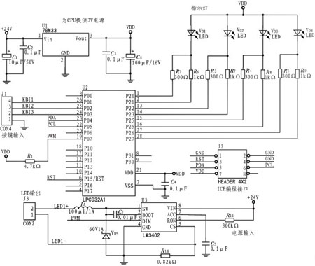 P89LPC932是由飛利浦生產(chǎn)的低功耗單片微處理器,電源電壓3.3V,可低功耗運行,適合于許多要求高集成度、低成本的場合??梢詽M足多方面的性能要求。P89LPC932采用了高性能的處理器結(jié)構(gòu),指令執(zhí)行時間只需2~4個時鐘周期,6倍于標(biāo)準(zhǔn)80C51器件。P89LPC932集成了許多系統(tǒng)級的功能,這樣可大大減少元件的數(shù)目、電路板的面積以及系統(tǒng)的成本,其內(nèi)部有2個定時器,可作為一個具有256個定時器時鐘周期的PWM發(fā)生器使用。LED調(diào)光電路電氣原理圖如圖2所示。