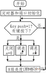 控制器程序根據(jù)3個按鈕的輸入狀態(tài),實現(xiàn)開關(guān)或亮度調(diào)節(jié),并將亮度狀態(tài)在4個指示燈上顯示出來。利用微處理器自身集成的EEPROM單元,可隨時保存亮度狀態(tài)n(PWM占空比)。主程序流程框圖如圖3所示。