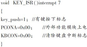 經(jīng)檢測,在同等照度要求的情況下,采用LED調(diào)光控制系統(tǒng)的功耗較白熾燈降低90%以上,當(dāng)然為進一步降低能耗,節(jié)能方法的探究仍然具有十分重要的意義。在多數(shù)時間,HBLEDs可能處于熄滅狀態(tài),若控制系統(tǒng)處于待機狀態(tài)或掉電狀態(tài),可將功耗降低到最低;或?qū)FF端口接地,也可將LM3402置于一個極低的低功率關(guān)機狀態(tài)。將微處理器P89LPC932的電源控制寄存器PCONA設(shè)置為0xFF時,外部功能模塊掉電;將電源控制寄存器PCON設(shè)置為03H時,可將微處理器處于完全掉電狀態(tài),只有在中斷觸發(fā)的時候,才能喚醒,隨即給外部功能模塊上電,微處理器開始工作。微處理器主要通過鍵盤中斷喚醒,鍵盤中斷參考程序如下: