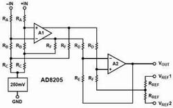 AD8205的內(nèi)部電路由A1和A2兩個(gè)集成運(yùn)放和一個(gè)電阻網(wǎng)絡(luò),以及一個(gè)小參考電壓源和偏置電路構(gòu)成,其電路結(jié)構(gòu)如圖1所示。