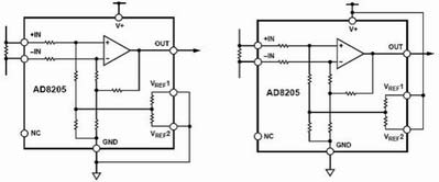 雙極性輸出時(shí)AD8205可以測(cè)量流過(guò)采樣電阻上的雙向電流,這時(shí),輸出可以偏置到輸出范圍內(nèi)的任意位置。當(dāng)被檢測(cè)的正反兩個(gè)方向上的電流為等幅時(shí),其輸出必須偏置到滿量程輸出的中間位置。當(dāng)雙向電流幅值不對(duì)稱(chēng)時(shí),輸出偏置可以對(duì)應(yīng)地偏離半量程位置。它的兩個(gè)參考輸入VREF1和VREF2分別連接一個(gè)內(nèi)部電阻RREF后接到同一個(gè)內(nèi)部偏置節(jié)點(diǎn),這兩個(gè)參考輸入端的操作方式完全相同。在兩個(gè)參考電壓輸入端接入對(duì)應(yīng)的電壓,即可完成對(duì)輸出的偏置。在雙極性輸出方式下,一般有以下兩種連接方式。