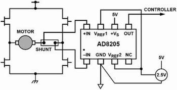 如圖5所示連接,AD8205在H橋馬達(dá)控制電路中作為控制回路的一部分,馬達(dá)和采樣電阻串連后放置在H橋的中間,通過(guò)檢測(cè)采樣電阻上的電壓,可以準(zhǔn)確地測(cè)量馬達(dá)當(dāng)前的電流及其方向。此時(shí),AD8205的輸出被設(shè)定成外部參考雙向的方式,這樣它可以測(cè)量H橋開(kāi)關(guān)的雙向電流并同時(shí)監(jiān)測(cè)馬達(dá)的運(yùn)轉(zhuǎn)方向。由于地不是一個(gè)特別穩(wěn)定的參考電平,以地為參考將會(huì)導(dǎo)致測(cè)量的不準(zhǔn)確性。因此,這種測(cè)試方案要比以地作為參考電平的測(cè)試方法好的多。