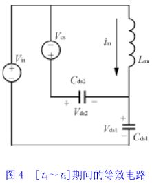 [t4~t5]期間電容cds1、cds2與lm發(fā)生諧振,并在t5時刻電壓vds1下降到vin,變壓器磁芯完成磁恢復(fù)。